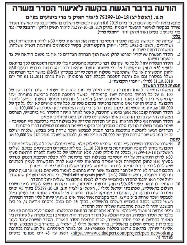 ת"צ – 75299-10-18 הצדדים – ליאור חאיק נ' פרי ביצועים בע"מ תאריך פרסום – 10/12/19 תקציר – עניינה של הבקשה בטענה שלפי המשיבה הפרה את הוראות סעיף 30א לחוק התקשורת, בקשר למסרונים והודעות דוא"ל ששלחה. הסדר הפשרה יחול על כל מי שקיבלו דבר פרסומת מהמשיבה בלי שניתנה הסכמתם לכך בהתאם לחוק התקשורת. המשיבה תפצה כל אחד […]