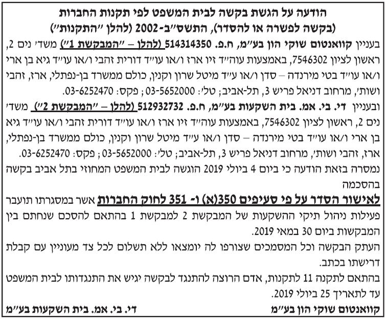 הודעה על הגשת בקשה לבית המשפט לפי תקנות החברות הצדדים – קוואנטום שוקי הון בע"מ ודי.בי.אמ בית השקעות בע"מ תאריך פרסום – 5.7.2019 תקציר – הוגשה בקשה לאישור הסדר פשרה במסגרתו תועבר פעילות ניהול תיקי ההשקעות של המבקשת 2 למבקשת 1 בהתאם להסכם שנחתם בין המבקשות ביום 30 במאי 2019. ב"כ המבקשות – משרד בן-נפתליי, ארז, […]