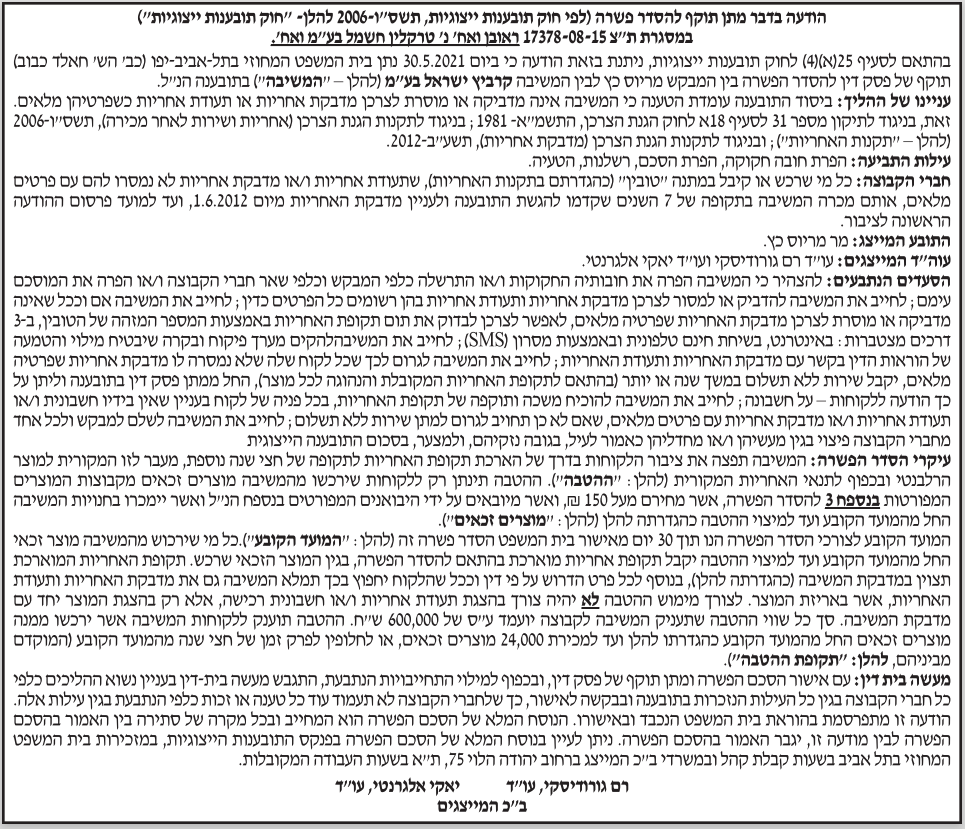 ת"צ – 17378-08-15 הצדדים – ראובן ואח' נ' טרקלין חשמל בע"מ וקרביץ ישראל בע"מ תאריך פרסום – 09.06.2021 תקציר – בטענה כי המשיבה אינה מדביקה או מוסרת לצרכן מדבקת אחריות או תעודת אחריות הנושאת את פרטי הרכישה המלאים, וזאת בניגוד לחוק להגנת הצרכן (אחריות ושירות לאחר מכירה, מדבקת אחריות) ב"כ המבקש – רם גורודיסקי, עו"ד, יאקי […]