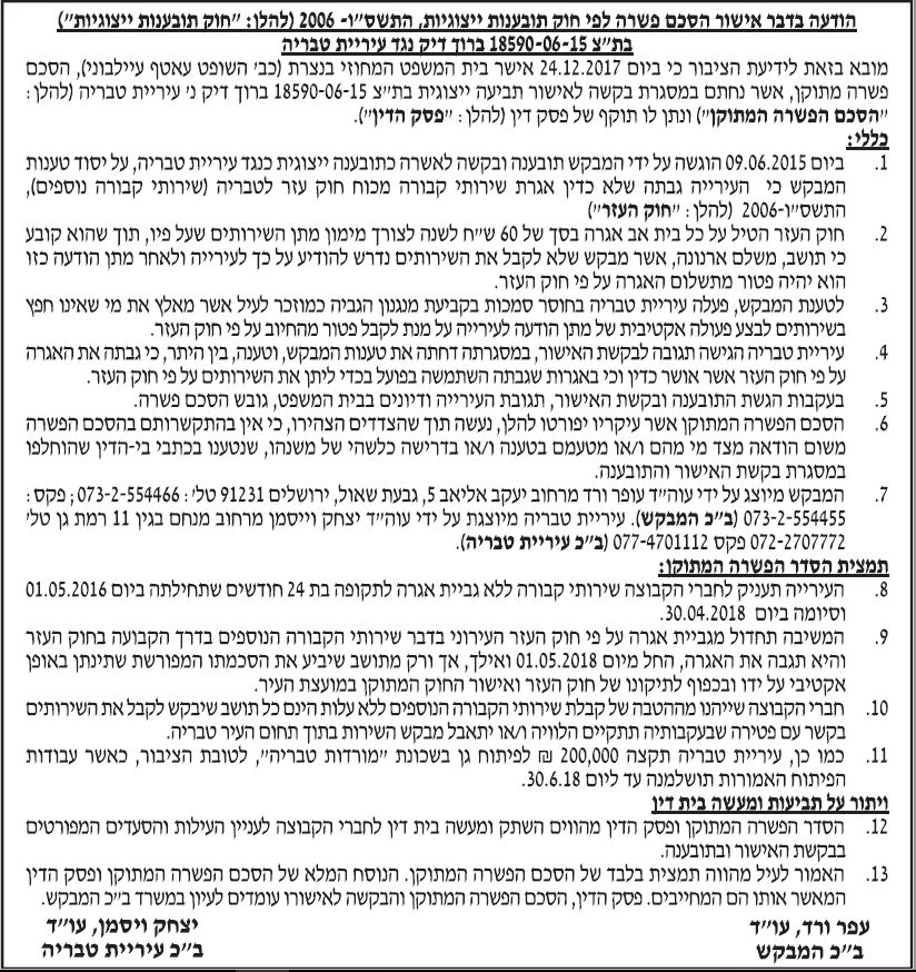 תביעה ייצוגית | עיריית טבריה [02/01/2018]