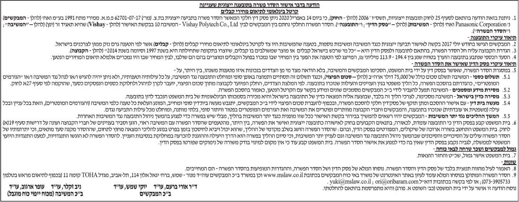 ת"צ 62701-07-17 הצדדים – פ.מ.א ממירי מתח 1991בע"מ ואח' נגד Panasonic תאריך פרסום: 24/05/2020 תקציר – הטענה כי היו צד לקרטל בינלאומי לתיאום מחירי קבלים אשר לפי הטענה גרם נזק ממון לצרכנים בישראל ב"כ המבקשים: עו"ד אורי ברעם ועו"ד יוקי שמש ב"כ המשיבה: עו"ד ניב זקלר ועו"ד עופר ארגוב המודעה פורסמה בעיתון דה-מרקר ובעיתון גלובס נשמח […]