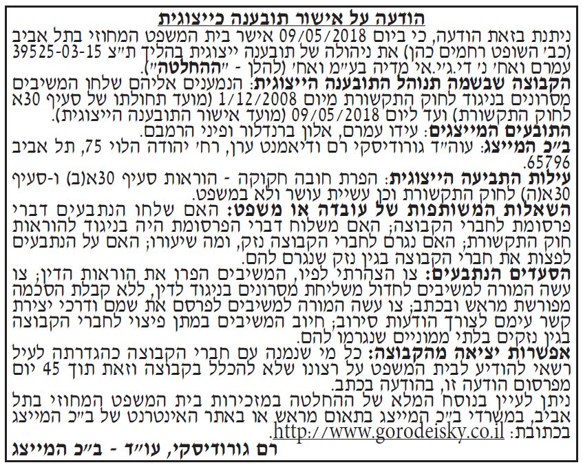 ת"צ 47661-11-18 הצדדים – לילך דונשיק נ' טקטיקה ניהול מועדוני לקוחות בע"מ ויובל גנות תאריך פרסום: 12/07/2020 תקציר – הטענה כי המשיבים שלחו מסרוני פרסומת ללא קבלת הסכמתם של המבקשים תוך הפרה על חוק התקשורת. ב"כ המבקש- עו"ד רם גורודיסקי ב"כ המשיבה-עו'"ד דפנה קליין המודעה פורסמה בעיתון מעריב הבוקר ובעיתון ישראל היום נשמח לפרסם לכם מודעת תובענה ייצוגית/ הסדר פשרה בעיתון