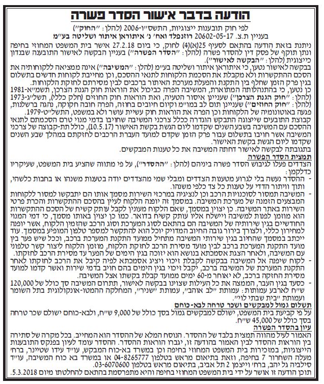 ת"צ – 45281-04-14 הצדדים – פז יואב נ' פלאפון תקשורת בע"מ תאריך פרסום – 5.6.2019 תקציר – עניינו של ההליך בטענה כי פלאפון מפרה את סעיף 55.4 לרישיון, המורה לחסום מנויים לשירותי תוכן ו/או מידע מתמשכים שבסעיף 3 ל"טופס גישה לשירותים באמצעות המכשיר הסלולרי המחויבים בחשבון הטלפון, במקרה שהמנויים לא העבירו לה את התייחסותם לטופס […]