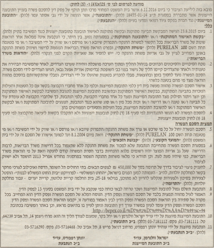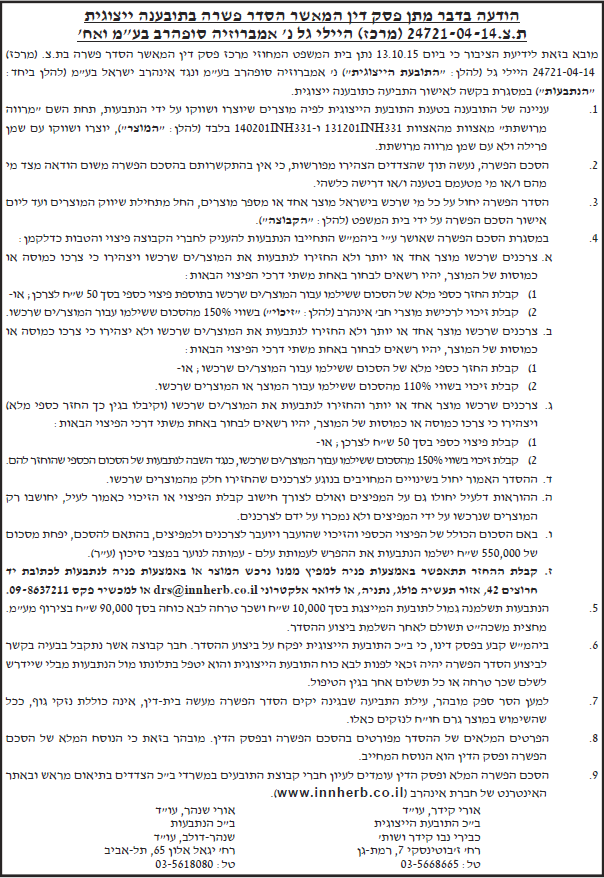 ת"צ: 24721-04-14 הצדדים: היילי גל נ' אמברוזיה סופרהרב בע"מ ונגד אינהרב ישראל בע"מ תאריך פרסום: 01/01/16